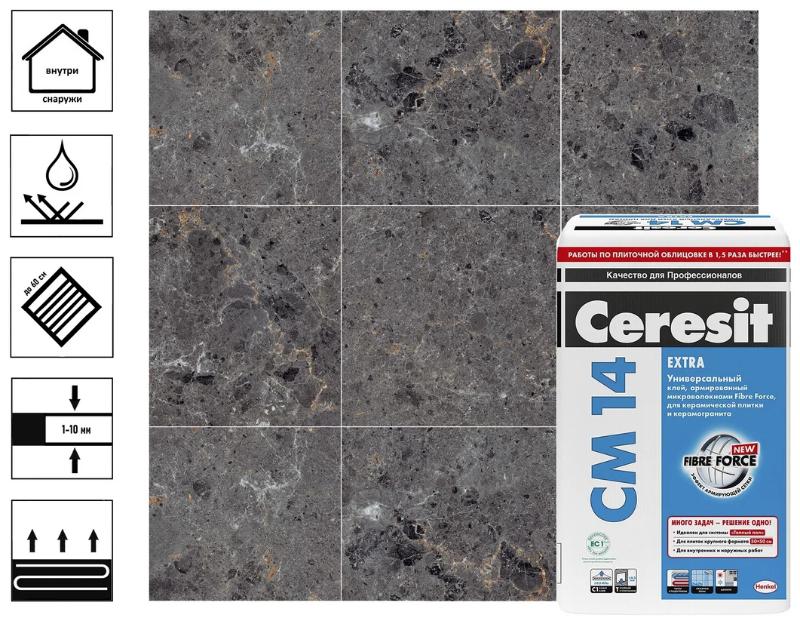 Клей CM 14 Extra предназначен для крепления всех видов керамических плиток, керамогранита, плиток из искусственного (на цементной основе) и природного (кроме мрамора) камня размером до 50х50 см - на стенах и полах, внутри (включая влажные помещения и стяжки с подогревом) и снаружи зданий.Клей Ceresit CM 14 обладает высокими показателями характеристик, обеспечивающих высокое качество покрытия, а именно:
